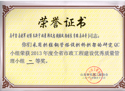 “采用拱弦鋼管搭設拱橋拱架的研究”QC小組榮獲2013年度全省市政工程建設優秀質量管理小組二等獎