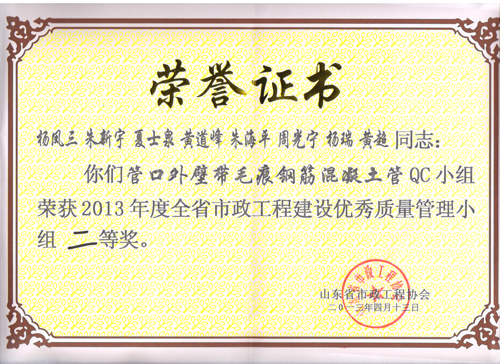 “管口外壁帶毛痕鋼筋混凝土管”QC小組榮獲2013年度全省市政工程建設(shè)優(yōu)秀質(zhì)量管理小組二等獎(jiǎng)