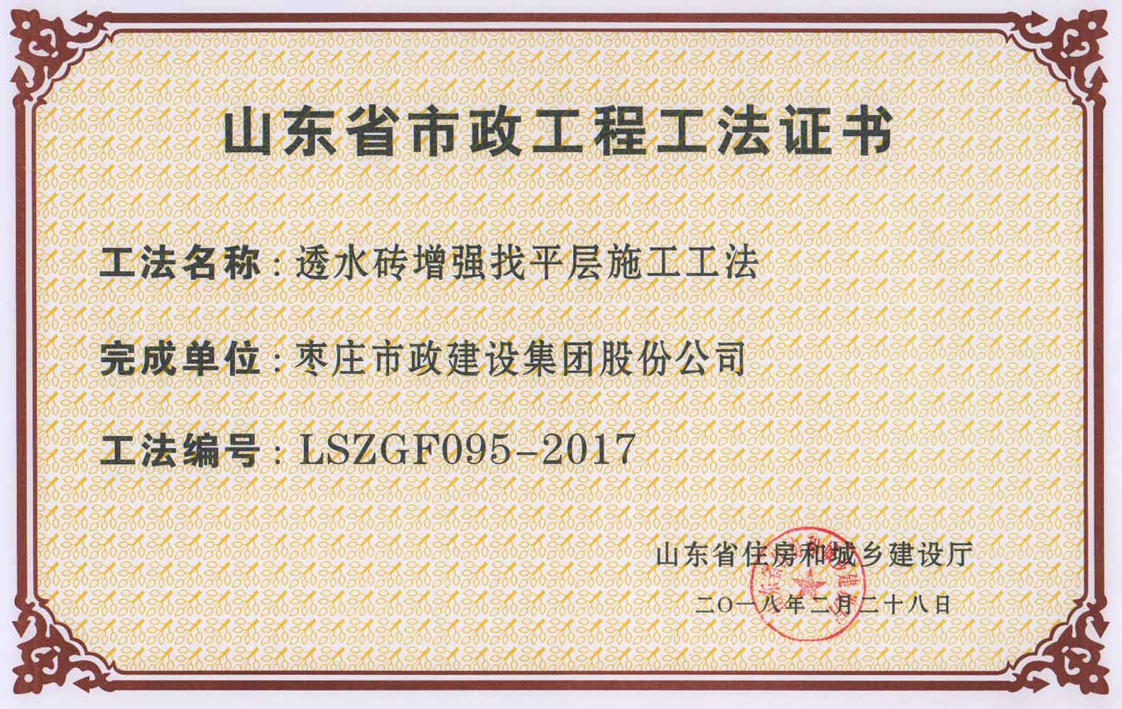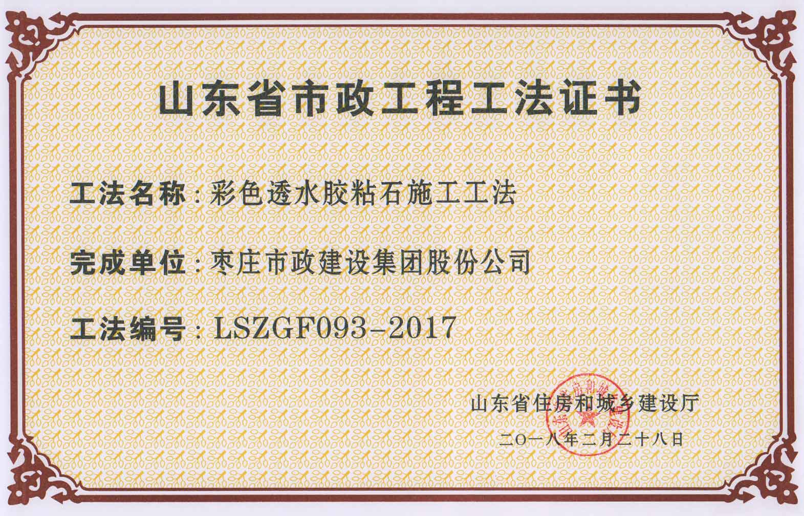 日前,由我公司編制的《彩色透水膠粘石施工工法》、《直埋電纜防盜器施工工法》、《透水磚增強找平層施工工法》獲評“2017年度山東省市政工程工法”。同時,我公司施工的棗莊市體育中心體育場西側室外市政工程和棗莊市市中區青檀路改造工程獲評“山東省市政基礎設施工程安全文明工地”。此次全省共有154個工法、160個項目經過專家評審和檢查,最終分別獲得上述兩項榮譽。