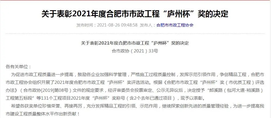 此獎的獲得,是合肥市人民政府、合肥市市政工程協會對集團公司承建工程質量的充分肯定,集團公司將繼續嚴格把控工程質量,高標準、高要求狠抓項目精細化管理,力爭打造更多優質工程。