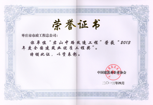 “君山中路改造工程”榮獲“2013年度全國(guó)建筑業(yè)優(yōu)質(zhì)工程獎(jiǎng)”