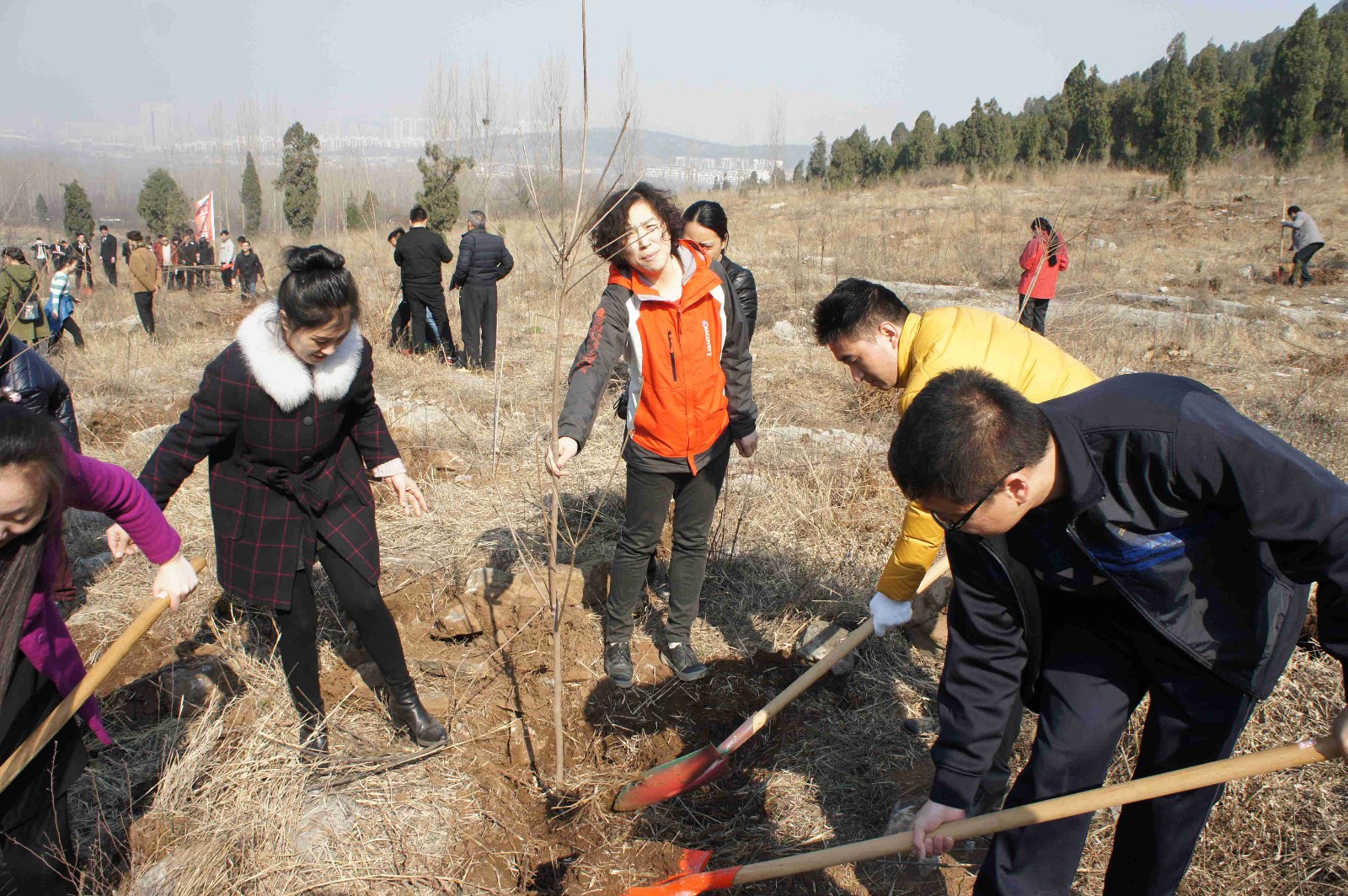 在市農業局的專業技術人員的指導下,參加植樹活動的同志們,自覺分工、各司其職,大家挖坑、扶苗、填土、澆水……忙的不亦樂乎。盡管天氣有些冷,但是大家的熱情更加高,許多人額頭上都掛著汗珠,但當大家看著自己親手種下的小樹苗時便忘記了勞累。在活動最后,志愿者們在獵獵招展的棗莊市政大旗和共青團團旗下,一起與自己親手種下的樹苗合影留念。