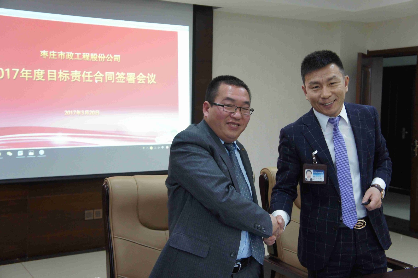 3月20日上午,棗莊市政工程股份公司召開2017年度目標責任合同簽署會議。全體高管、各部門(各分公司)主要負責人以及上海慧樸管理咨詢公司工作人員在辦公樓12樓會議室參加了會議。趙峰董事長(總經理)代表公司同各部門(各分公司)主要負責人簽署了《2017年度目標責任合同》。會議由劉博副總經理主持。
