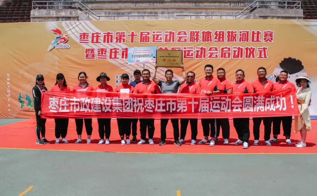 由棗莊市人民政府主辦,市體育局承辦的棗莊市第十屆運(yùn)動(dòng)會(huì)群體組拔河比賽于5月29日在市體育中心體育場(chǎng)舉行。來自全市上百名拔河隊(duì)員經(jīng)過一天的激烈角逐,我公司代表隊(duì)(棗莊市政·紫悅山)最終獲得了亞軍。